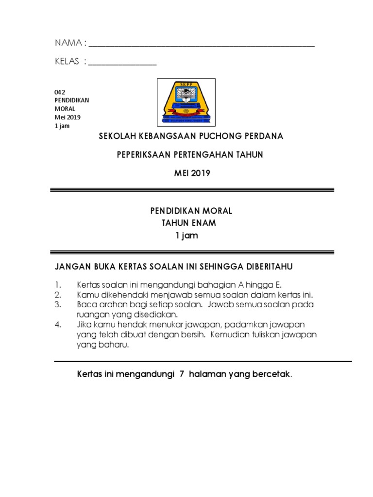 Soalan Peperiksaan Pertengahan Tahun Pendidikan Moral Tahun 6 Menarik Peperiksaan Semester 1 Pk Tahun 5 Skoloh
